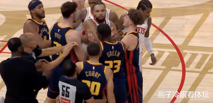 到了第二节,冲突果然还是来了。本节还剩5分钟,火爆场面出现,追梦掩护的过程中,阿门倒地。另一边,狄龙将库里撞翻。